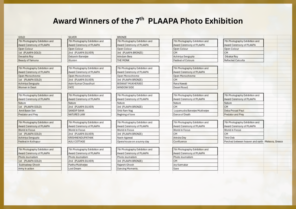 The 7th Photography Exhibition & Award Ceremony of PLAAPA (Photography Lovers – An Abode of Photo Addicts) was held in April 2026 at Gallery Gold, Kolkata. The event brought together emerging and established photographers from across India, reflecting the growing influence of salon photography culture in the region.